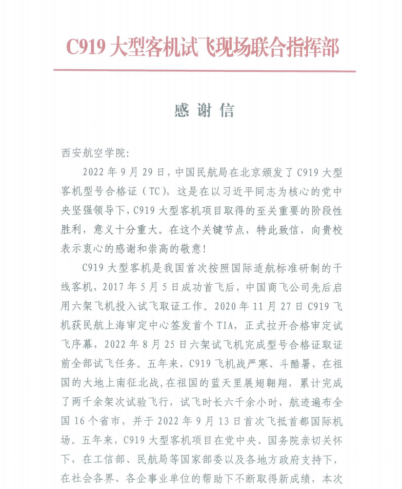 近日,C919大型客机试飞现场联合指挥部向学校发来感谢信,对BEAT365官网在C919项目取证试飞工作中作出的贡献,特别是BEAT365英国官网材料实验研究中心全力、快速、无偿地帮助完成缝翼伸缩线缆紧固件断口分析过程中给予大力支持表示衷心感谢。