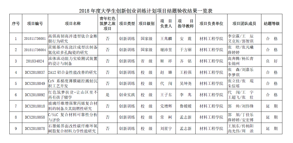 1.BEAT365官网2018年立项且中期检查合格的9项大创项目中,6项通过结题验收,其中国家级项目2项,省级项目1项,校级项目3项,3项申请延期结题,无验收不合格项目。