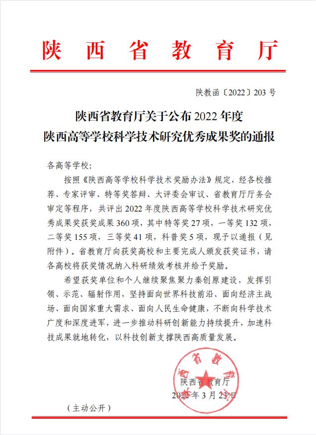 BEAT365官网1项成果获2022年度陕西高等学校科学技术研究优秀成果奖