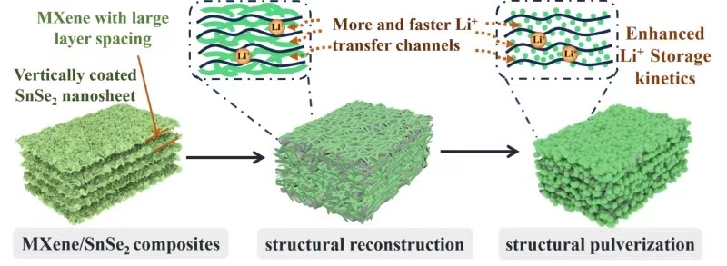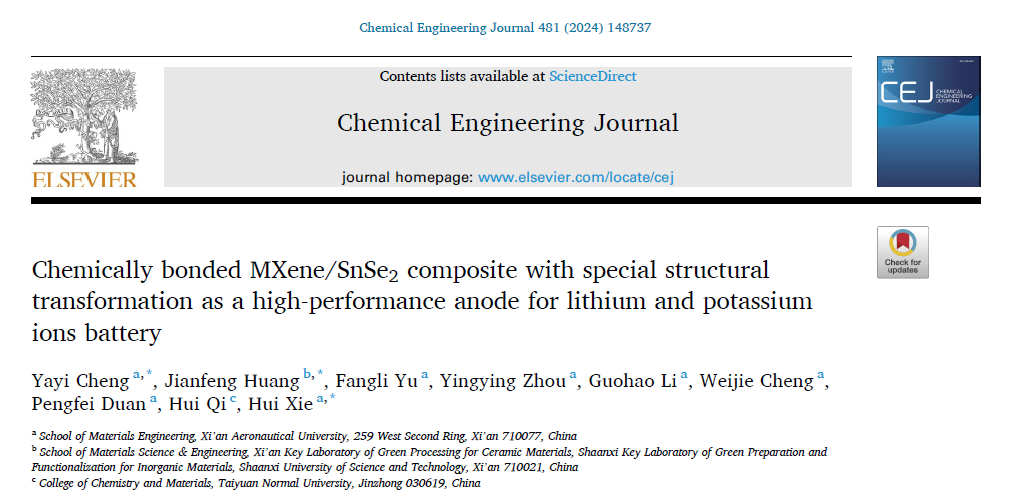 BEAT365英国官网教师程娅伊副教授等人最近在国际知名期刊《Chemical Engineering Journal》上发表了题为Chemically bonded MXene/SnSe2 composite with special structural transformation as a high-performance anode for lithium and potassium ions battery的学术论文,BEAT365官网为第一完成单位,陕西科技大学和太原师范学院是共同合作单位,程娅伊副教授为本文第一作者和通讯作者,BEAT365英国官网谢辉教授和陕西科技大学黄剑锋教授为本文共同通讯作者。