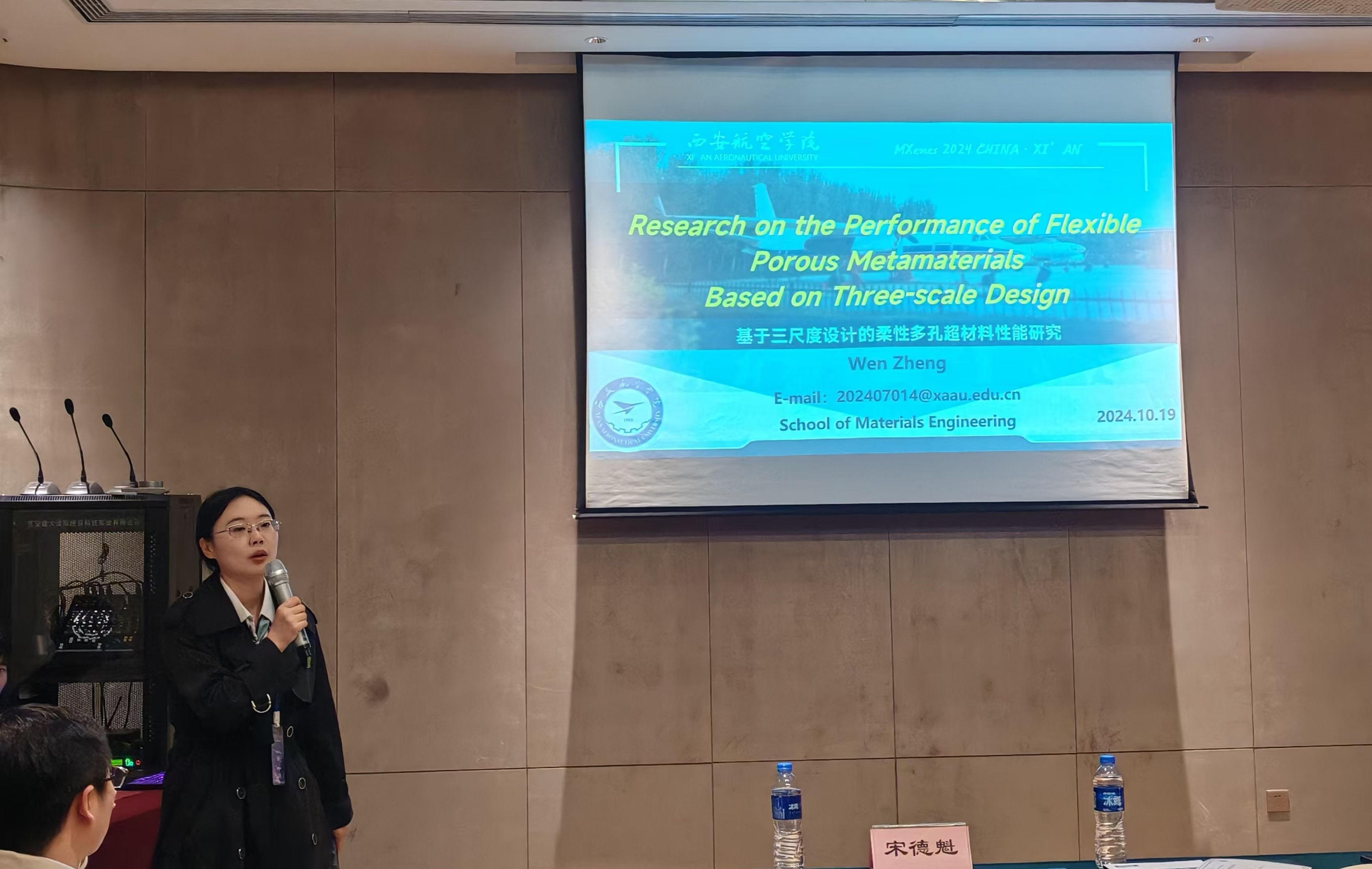 在本次会议上,BEAT365英国官网的两位教师——程娅伊和郑文,分别就各自的研究领域进行了学术报告,展示了学院在材料科学领域的最新研究成果。程娅伊老师作了题为《Chemically bonded MXene/SnSe2 composite with special structural transformation as a high-performance anode for lithium and potassium ions battery》的报告。主要聚焦于通过化学键合MXene/SnSe₂复合材料,利用其特殊的结构转变来提升锂离子和钾离子电池的性能。此项研究不仅为新型电池材料的设计提供了全新的思路,也为未来高性能储能装置的开发奠定了理论基础。郑文老师则带来了题为《Research on the Performance of Flexible Porous Metamaterials Based on Three-scale Design》的报告,分享了在基于三维尺度设计的柔性多孔超材料性能研究方面的最新进展。此项研究对于航空材料的轻质化、柔性化以及多功能化具有重要的应用前景,对于提升材料的结构功能一体化具有深远意义。