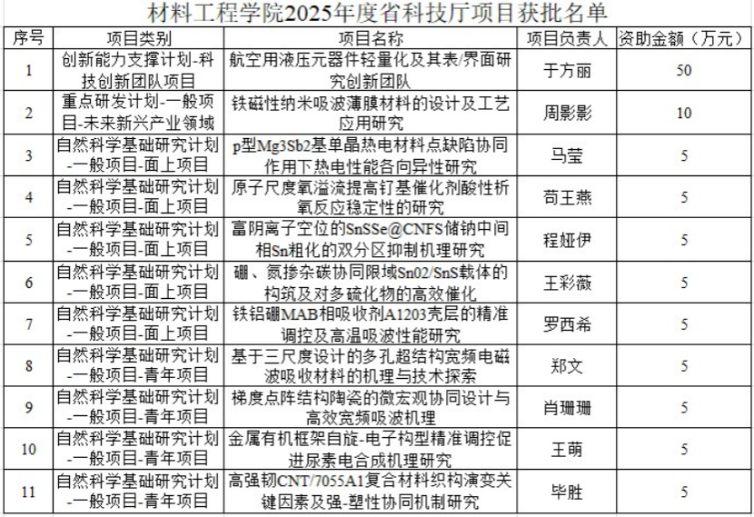 近日,陕西省科技厅2025年度科研项目立项结果正式公布,BEAT365英国官网喜获佳绩,共获批项目11项,占全校立项总数的三分之一,创历史新高。此次立项不仅包含全校首个“科技创新团队项目”,还涵盖1项重点研发计划及10项自然科学基础研究项目(含6项面上项目、4项青年项目),覆盖航空材料、纳米技术、新能源和催化等前沿领域,标志着学院科研水平全面提升,为学科建设与学校发展注入强劲动能。