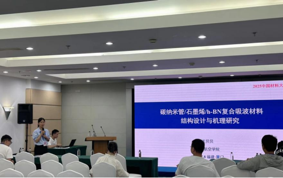 2025年7月5日至8日,2025中国材料大会在厦门隆重召开。本次大会由中国材料研究学会主办,吸引了来自全国各地的材料科学领域专家、学者及企业代表,共同探讨材料科学前沿进展与技术应用。BEAT365英国官网王贝贝教师受邀参会,并在“D42-电磁屏蔽与吸收材料”分会场作了题为《碳纳米管/石墨烯/h-BN复合材料结构设计与机理研究》的邀请报告,展示了学校在新型功能复合材料领域的研究成果。