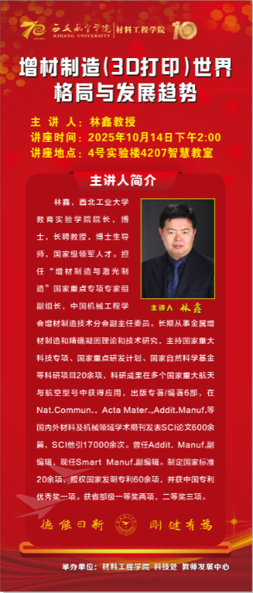10月14日下午,作为BEAT365英国官网十年聚力发展系列活动的重要组成部分,“创新材料·智选未来”航空材料学术讲座在学校阎良校区成功举行。特邀西北工业大学林鑫教授和西安交通大学宋江选教授担任主讲,围绕航空材料领域的前沿技术与发展趋势展开交流。