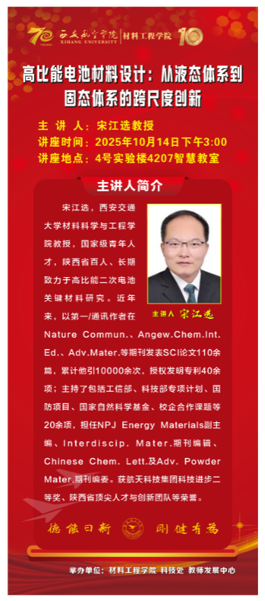 宋江选教授作了题为《高比能电池材料设计:从液态体系到固态体系的跨尺度创新》的学术分享,从“双碳”战略与能源安全需求出发,指出了发展高比能、长寿命、高安全储能体系的紧迫性,重点介绍了其团队在水系有机液流电池、高容量锂金属电池等体系中的创新成果,为航空器动力电源的创新研发提供了重要思路。